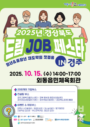 경주시는 오는 15일 외동읍민체육회관에서 ‘2025 경북 드림 JOB 페스타’를 개최한다고 1일 밝혔다.이번 행사는 고용노동부, 경상북도, 경주시가 주최하고, 경주고용복지플러스센터, 경북경영자총협회, 경주시취업지원센터 등이 주관한다.현장에서는 기업채용관과 채용지원관을 운영하며 구인‧구직자 간 맞춤형 취업 매칭을 지원한다.기업채용관은 ㈜디에스시, 덕일오토모티브㈜ 등 지역 우수기업 20여 곳이 참여해 취업 상담과 현장 면접을 진행한다.