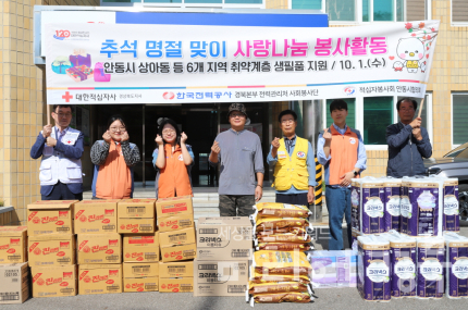 한국전력 경북본부(본부장 박경수)가 1일, 추석 명절 맞이 사랑나눔 봉사활동을 통해 변전소 인근 상이동 취약계층 가구 15세대를 대상으로 120만원 상당의 생필품 세트를 전달했다.
