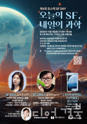 POSTECH(포항공과대학교) 소통과 공론 연구소가 다음 달 1일 캠퍼스 내에 있는 체인지업그라운드 이벤트홀에서 ‘제4회 ’포스텍 SF DAY: 오늘의 SF, 내일의 과학’을 개최한다. ‘포스텍 SF DAY’는 대학 구성원과 포항 시민들에게 SF(Science Fiction)의 매력과 의미를 전하는 행사로 올해로 4회를 맞는다. 이번 행사는 이 대학 출신의 세계적인 SF 작가 김초엽의 POSTECH 인문사회학부 특임교수 임명을 기념하는 특별한 자리로, 김초엽 작가의 특임교수 임명식도 북토크에 앞서 진행되어 더욱 의미를 더한다. POSTECH 화학공학과를 졸업한 김초엽 작가는 `순례자들은 왜 돌아오지 않는가`로 등단한 이후 `우리가 빛의 속도로 갈 수 없다면`, `지구 끝의 온실` 등을 통해 국내외에서 큰 사랑을 받아왔다. 이번 북토크에서는 `양면의 사랑, 반짝이는 슬픔`이라는 주제로 작품 세계와 창작 이야기를 풀어놓는다. 특히, 미술사학자인 우정아 POSTECH 인문사회학부 교수가 대담자로 참여해, 과학과 인문학의 경계를 넘나드는 깊이 있는 대화를 나눌 예정이다.