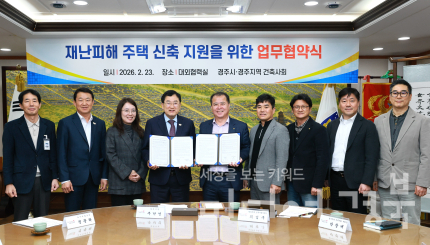 경주시는 23일 경주지역 건축사회와 ‘재난피해 주택 신축 지원을 위한 업무협약’을 체결했다고 24일 밝혔다.청내 대외협력실에서 열린 협약식은 화재·지진 등 재난으로 주택이 전소되거나 파손된 시민들의 빠른 주거 안정을 지원하기 위해 마련됐다.협약에 따라 경주시는 재난 피해주택 신축 대상자에게 설계·감리비 감면 지원을 안내하고, 건축 인허가 등 관련 행정절차를 관계 법령이 허용하는 범위에서 신속히 처리하기로 했다.경주지역 건축사회는 재난 피해주택 신축 지원에 참여할 건축사 인력풀을 구성·관리하고, 피해주민과의 원활한 연계를 위해 해당 정보를 경주시에 제공하기로 했다.특히 참여 건축사는 재난 피해주택 신축 주민에게 설계·감리비를 50% 수준으로 감면해 제공하는 데 협조하기로 했다.