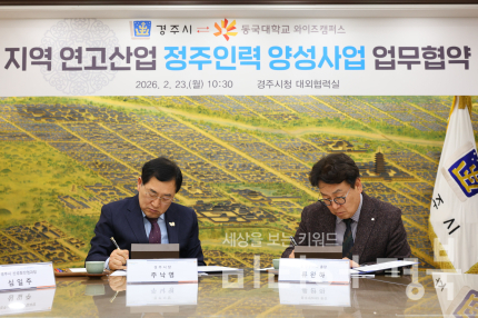 경주시와 동국대학교 WISE캠퍼스가 지역 주력 산업인 자동차 부품 산업의 미래차 전환을 이끌 전문 인력 양성과 청년 정착 기반 마련에 힘을 모은다.경주시는 23일 시청 대외협력실에서 동국대학교 WISE캠퍼스와 ‘지역 연고산업 정주인력 양성사업’ 추진을 위한 업무협약을 체결했다고 24일 밝혔다.이번 사업은 행정안전부 지방소멸대응기금과 중소벤처기업부 시군구 연고산업 육성사업을 연계한 협업 모델이다. 올해부터 내년까지 2년간 총 7억 원(지방소멸대응기금 6억 원·시비 1억 원)을 투입해 미래차 분야 핵심 인재를 양성하고, 이들이 지역에 정주할 수 있는 선순환 구조를 구축하는 데 주력한다.주요 사업은 단계별 맞춤형 교육과정으로 운영된다. △미취업 청년을 위한 ‘입문과정(4주)’ △채용 예정자를 대상으로 한 ‘기본과정(12주)’ △재직자 역량 강화를 위한 ‘심화과정(6개월)’ △기업 수요 기반 ‘맞춤형 단기교육’ 등을 통해 인력 수요에 체계적으로 대응할 계획이다.