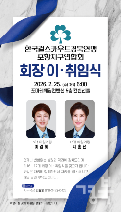 한국걸스카우트경북연맹 포항지구연합회가 25일 오후 6시 포항 포마레웨딩컨벤션에서 회장 이·취임식을 열고 새로운 출발을 알렸다.이날 행사에서는 제16대 이경하 회장이 이임하고, 지홍선 ㈜지홍선커뮤니케이션즈 대표가 제17대 회장으로 취임했다. 행사에는 걸스카우트 대원과 지도자, 지역 기관단체장 등이 참석해 그간의 노고를 격려하고 취임을 축하했다.지홍선 신임 회장은 취임사에서 “걸스카우트는 소녀가 잠재력을 발견하고 봉사로 성장하는 ‘내일의 리더’ 공동체”라며 “교육의 혁신과 더 넓은 교류, 지역과 함께하는 나눔으로 소녀들의 성장을 든든히 뒷받침하겠다”고 밝혔다. 이어 “한 명의 소녀가 자라면 미래가 바뀐다”며 지역사회의 관심과 협력을 당부했다.