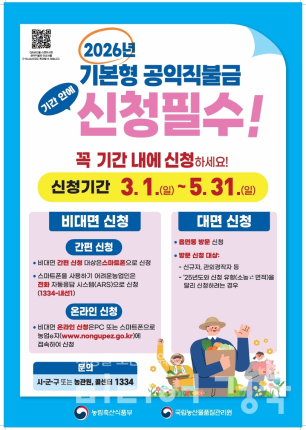 포항시는 농업인의 소득 안정과 농촌의 공익적 가치 확산을 위해 오는 5월 31일까지 ‘2026년 기본형 공익직불금’ 신청을 접수한다. 공익직불제는 환경 보전, 농촌 유지 등 농업의 공익 기능을 수행하는 농업인에게 보조금을 지급해 안정적인 소득 기반을 마련해 주는 제도다. 특히 올해부터는 신청 방식에 따른 혼선을 방지하고 농업인의 접근성을 높이기 위해 비대면과 대면 신청 기간을 통합 운영한다. 2026년 기본형 공익직불금은 지급 요건에 따라 ‘소농직불금’과 ‘면적직불금’ 두 가지 유형으로 나눠 지급된다. 우선, 일정 요건을 충족하는 소규모 농가에는 소농직불금 130만 원이 정액으로 지급된다. 대상은 ▲농지 합계 면적 5000㎡ 이하 ▲신청 연도 직전 3년 이상 영농 종사 및 농촌 거주 ▲농업 외 종합 소득금액이 개인 2000만 원, 농가 4500만 원 미만 등 요건을 갖춘 농가다. 소농직불금 대상이 아닌 농업인에게는 신청한 농지 면적에 따라 구간별 단가를 적용하는 ‘면적직불금’이 지급될 예정이다.