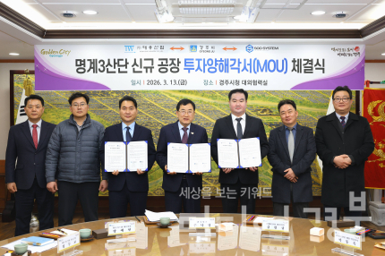 경주시는 ㈜태웅산업, ㈜수시스템과 내남면 명계3일반산업단지 내 공장 신설 및 본사 이전을 위한 투자양해각서(MOU)를 체결했다고 15일 밝혔다.지난 13일 시청 내 대외협력실에서 열린 협약식에는 주낙영 경주시장을 비롯해 김필규 ㈜태웅산업 대표이사, 방예현 ㈜수시스템 대표이사 등 기업 관계자들이 참석했다. 이번 협약에 따라 두 기업은 명계3산업단지 동일 부지 내 필지를 분할 활용해 신규 공장을 건립할 계획이다.㈜태웅산업은 약 7,920㎡ 규모 부지에 77억 원을 투자해 자동차 부품 생산 공장을 신설하고 15명을 신규 고용할 예정이다.㈜수시스템은 약 3,967㎡ 부지에 48억 원을 투자해 본사를 경주로 이전하고 생산시설을 구축하며 27명을 신규 채용할 계획이다.