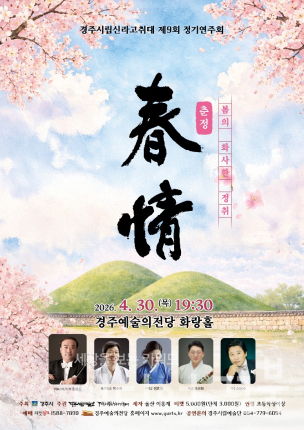 경주시립신라고취대 제9회 정기연주회 ‘춘정’이 오는 30일 오후 7시 30분 경주예술의전당 화랑홀에서 열린다.이번 공연은 신라의 전통성과 현대적 감각이 어우러진 무대로, 시민과 관광객에게 품격 있는 봄밤의 정취를 선사할 예정이다.무대는 고대문화공연과 국악관현악으로 구성된다. 1부에서는 처용무와 의식무를 중심으로 신라 고대 무대의 장중한 분위기를 되살리고, 2부에서는 국악관현악과 협연, 특별출연이 어우러진 다채로운 무대로 공연의 깊이와 대중성을 함께 담아낼 계획이다.특히 이번 연주회는 전통 예술이 지닌 고유의 아름다움을 현대적인 무대 언어로 풀어내며, 경주시립신라고취대만의 정체성과 예술성을 한층 선명하게 보여주는 자리가 될 것으로 기대된다.