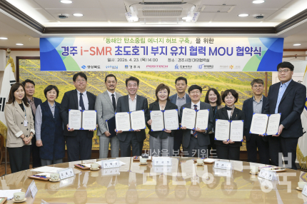 경주시가 경북도·포항시·지역 대학과 함께 SMR 초도호기 유치에 본격 나선다.경주시는 23일 시청 대외협력실에서 경북도, 포항시, 지역 4개 대학과 ‘경주 i-SMR 초도호기 부지유치’를 위한 업무협약을 체결했다고 밝혔다.참여 대학은 POSTECH, 한동대학교, 동국대학교 WISE 캠퍼스, 위덕대학교 등 4곳이다.이날 협약식에는 최혁준 경주시장 권한대행을 비롯해 양금희 경북도 경제부지사, 정규덕 포항시 수소에너지산업과장 등이 참석했다.대학에서는 김종규 POSTECH 부총장, 송인호 한동대 부총장, 박성범 동국대 WISE 캠퍼스 산학협력단장, 장덕희 위덕대 부총장이 참석했다.